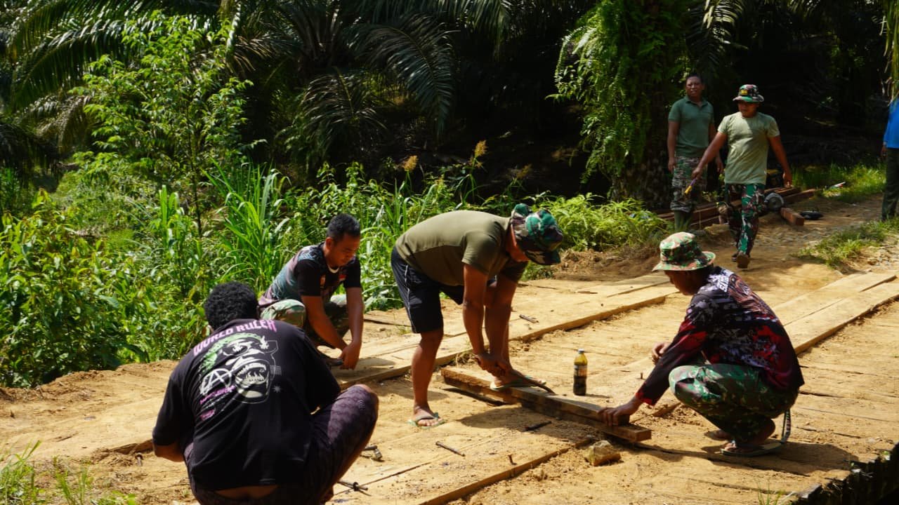 Kotawaringin Timur – Personel Satuan Tugas (Satgas) TNI Manunggal Membangun Desa (TMMD) Reguler ke-127 Kodim 1015/Sampit mulai membongkar jembatan yang merupakan akses jalan pertanian Desa Tri Buana, Kecamatan Telaga Antang, Kabupaten Kotawaringin Timur, Kamis (05/04/2026).