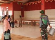 Anggota Satgas TMMD bersama warga setempat bahu-membahu membersihkan aula kantor Balai Desa Tri Buana serta lingkungan sekitar agar tetap bersih, sehat dan nyaman yang akan digunakan untuk pelaksanaan sunat massal.