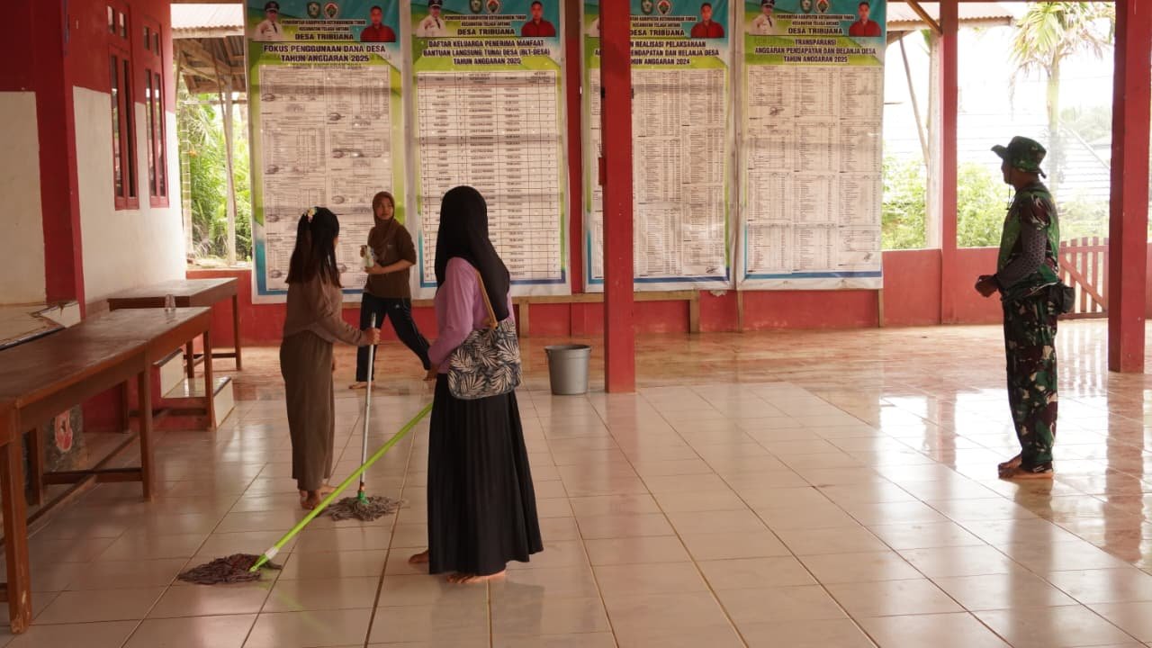 Anggota Satgas TMMD bersama warga setempat bahu-membahu membersihkan aula kantor Balai Desa Tri Buana serta lingkungan sekitar agar tetap bersih, sehat dan nyaman yang akan digunakan untuk pelaksanaan sunat massal.
