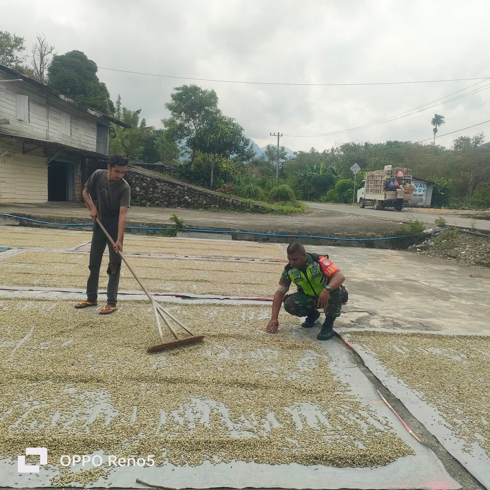 Babinsa Koramil 08/Silih Nara, Kodim 0106/Aceh Tengah, Kopka Yesayas  melaksanakan kegiatan komunikasi sosial (Komsos) dengan membantu warga menjemur kopi di Desa Genting Gerbang,