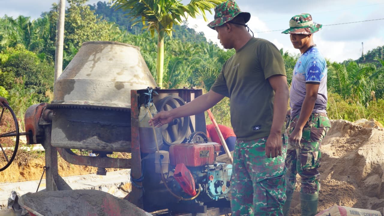 Kotawaringin Timur – Kebisingan mesin molen pengaduk material pasir, batu dan semen seringkali menimbulkan suasana tidak nyaman bagi siapa saja yang mendengarnya. Namun, tidak menjadi soal bagi masyarakat dan para prajurit TNI yang tergabung dalam Satuan Tugas TNI Manunggal Membangun Desa (Satgas TMMD Ke-127 Kodim 1015/Sampit yang sedang bergulat mengejar target pengerjaan siring badan jalan di desa Tri Buana, Kecamatan Telaga Antang, Kabupaten Kotawaringin Timur. Jum’at (20/02/2026).