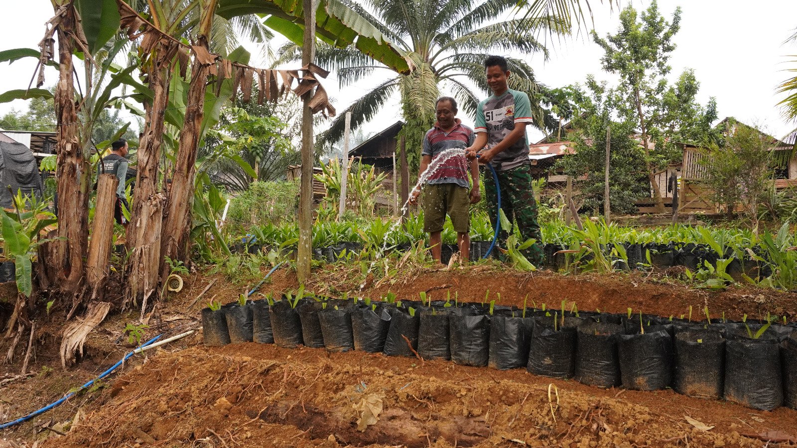 Seperti saat ini salah satu anggota Satgas TMMD Praka Erwanto tampak bersemangat membantu warga menyiram bibit sawit lahan tanam perkebunan warga yang berada tidak jauh dari lokasi sasaran TMMD.