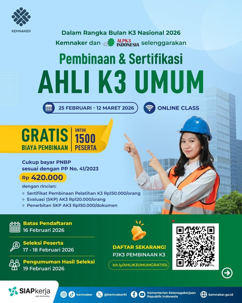 Pembinaan dan Sertifikasi Ahli K3 Umum akan dilaksanakan secara daring pada 25 Februari–12 Maret 2026. Pendaftaran dibuka hingga 16 Februari 2026 melalui tautan resmi: bit.ly/AHLIK3UMUMGRATISS.