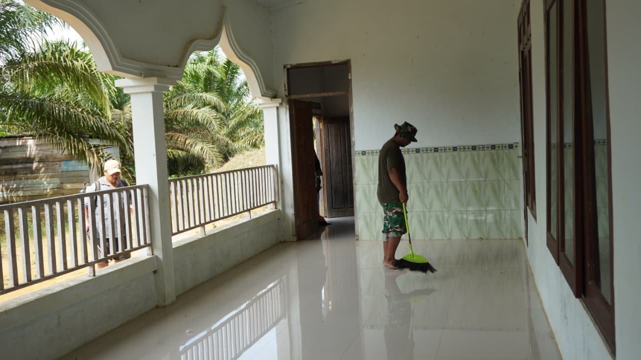 Dalam kegiatan ini, Praka Faisal bersama warga berjibaku untuk bersihkan Masjid Baiturrahman persiapan untuk pelaksanaan ibadah Sholat Jumat berjamaah.