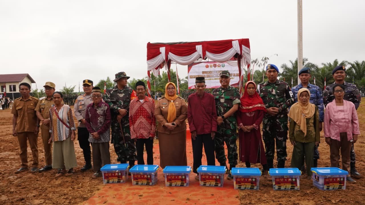 Selain upacara seremonial, momen ini juga diwarnai dengan penyerahan simbolis peralatan kerja kepada Satuan Tugas (Satgas) TMMD serta pembagian paket sembako kepada warga kurang mampu.
