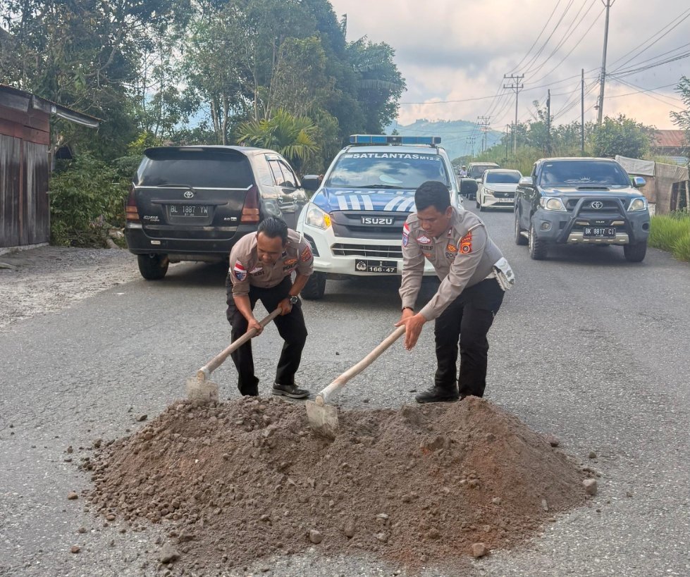 Polantas Polres Bener Meriah Gotong Royong Tambal Jalan Berlubang, Tekan Risiko Kecelakaan