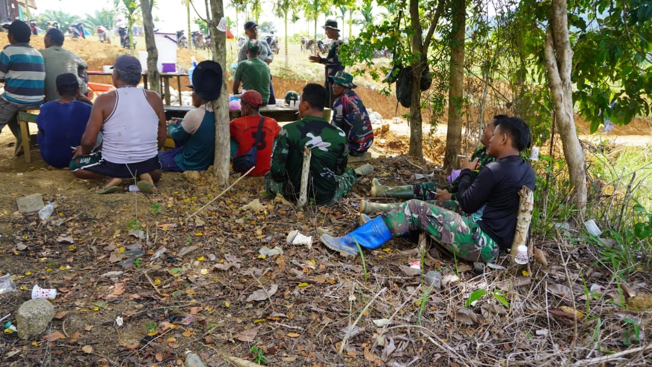 Tak hanya itu, disaat istirahat siang sambil santai mereka terlihat rukun dan akrab. Potret tersebut menandakan begitu dekat dan menyatunya TNI dengan Rakyat, suasana yang begitu nyaman dan terasa akrab, ditunjukan oleh anggota Satgas TMMD Rwg ke-127 Kodim 1015/Sampit saat melaksanakan istirahat siang, dengan diselingi canda dan tawa bersama.