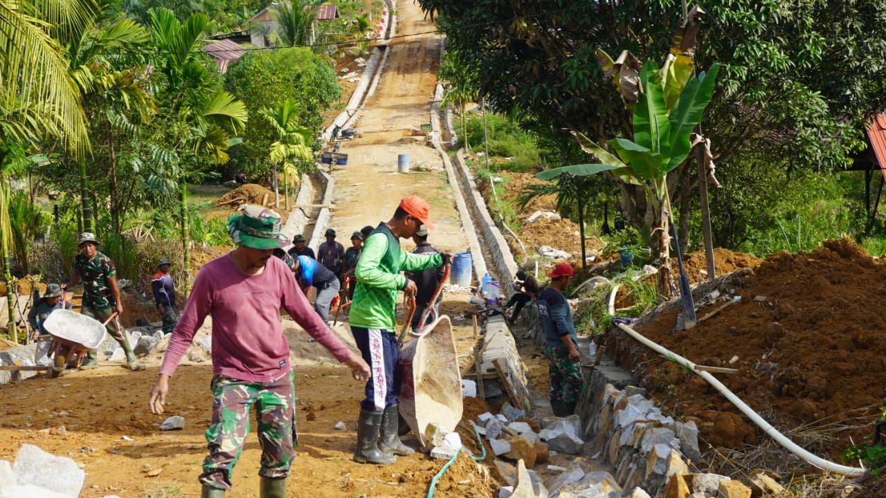Kotawaringin Timur – Demi mensukseskan TNI Manunggal Membangun Desa (TMMD) Reguler Ke-127 Anggota Satgas TMMD Kodim 1015/Sampit tetap melanjutkan pekerjaan sasaran Fisik di Desa Tribuana, Kec.Telaga Antang, Kab.Kotim, Minggu (15/02/26).